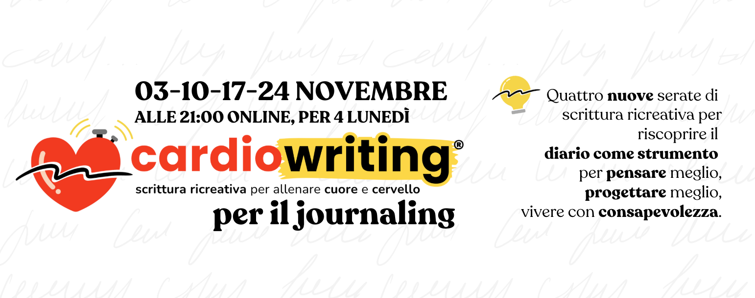 Il cardiowriting® è il mio allenamento di scrittura ricreativa: è composto di esercizi brevi, verticali, temporizzati che stimolano la nostra creatività e tendono a mettere da parte il nostro autocritico (che chiamiamo bulletto interiore). Dopo ogni esercizio c’è una brevissima micro-lezione di un minuto e poi chi lo desidera può condividere a caldo quello che ha scritto. Nessun giudizio, ci ascoltiamo e celebriamo insieme il coraggio di esprimerci. Per questo gli obiettivi del cardiowriting® sono l’autostima creativa e la condivisione solidale. Più in generale, lo facciamo per riappropriarci della scrittura come il potente strumento cognitivo che è.